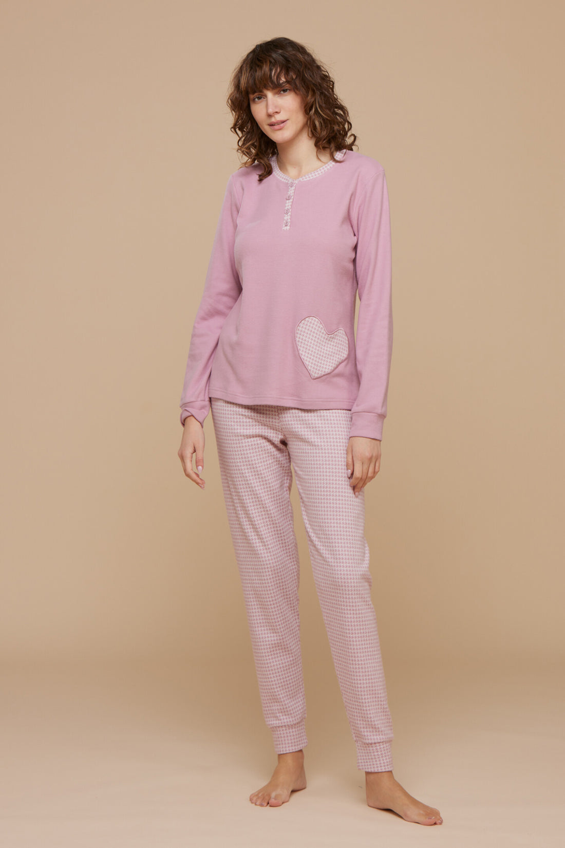 Pigiama donna heart in morbido caldo cotone con collo due bottoni, top tinta unita con...