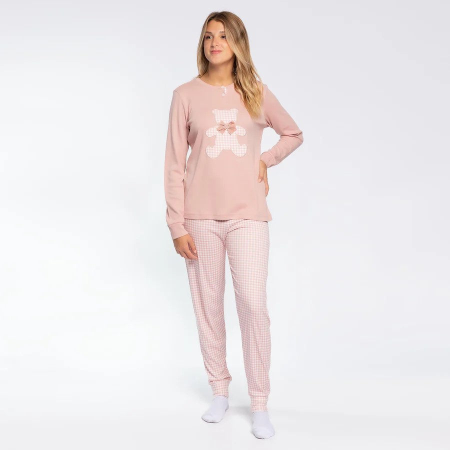Pigiama donna caldo cotone riga orso top manica lunga con scollo serafino e pantalone senza...
