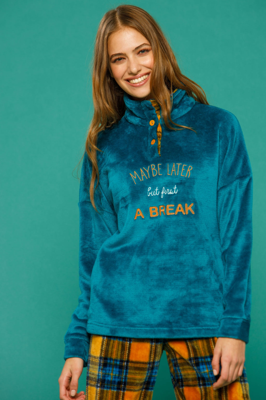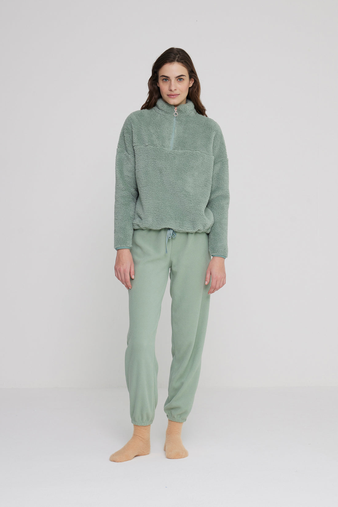 Pigiama donna coral pile, pantalone con polsini top con polsini e con applicazione e ricamo