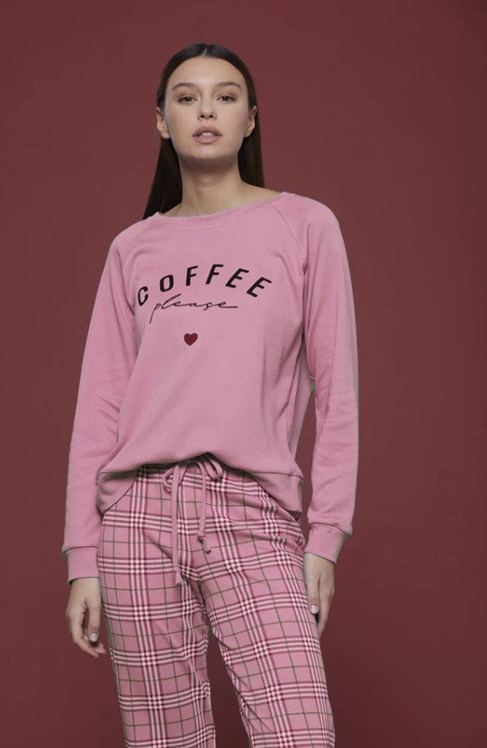 Pigiama donna caldo cotone berry con pantalone con stampa scozzese e top con stampa