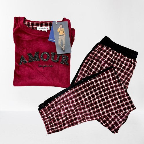 Pigiama donna ciniglia felpata soft touch top rosso girocollo con applicazione glitter e pantalone stampato...