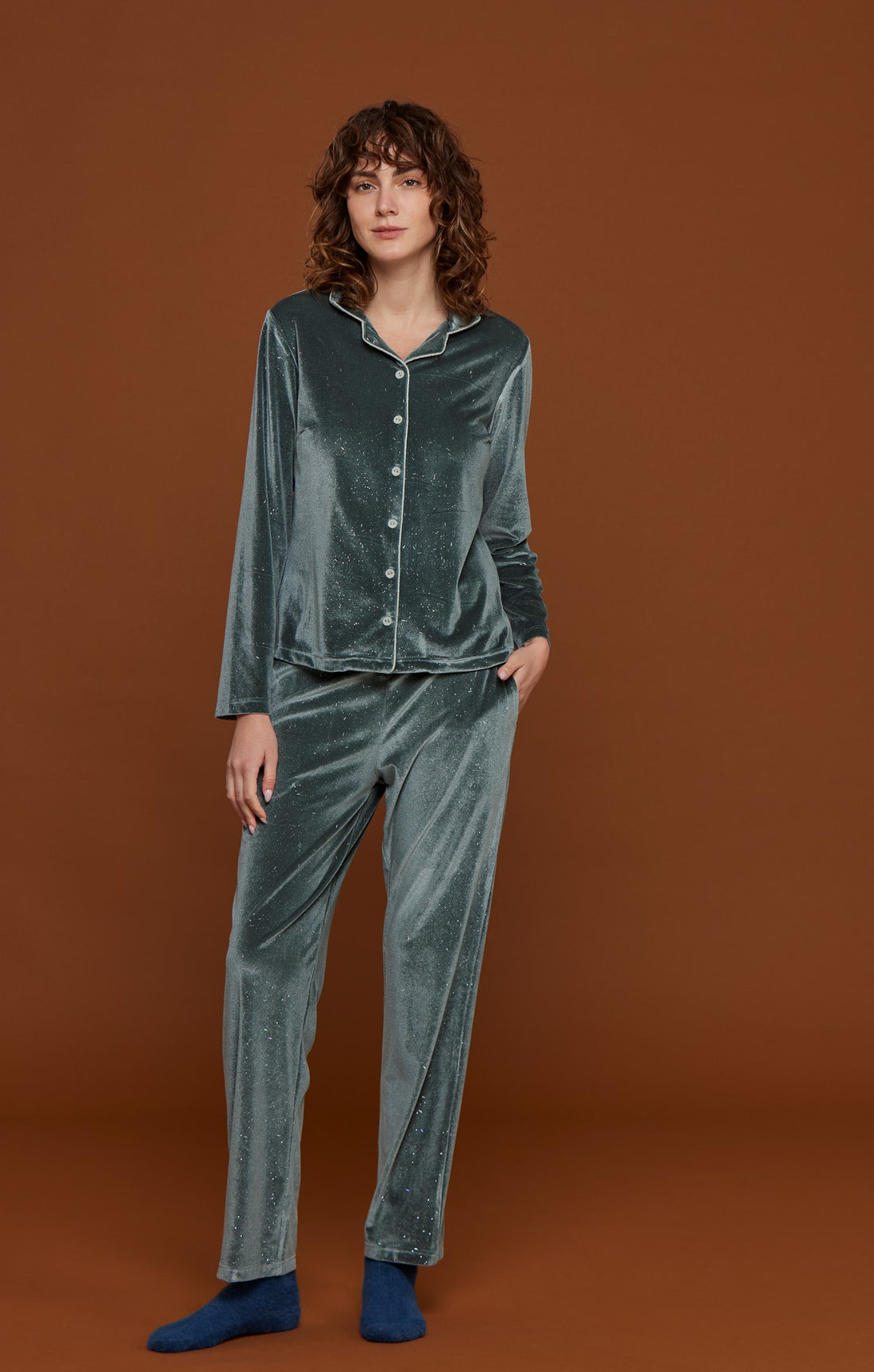 Pigiama donna ciniglia top in velluto manica lunga con abbottonatura centrale, colletto con rever e...