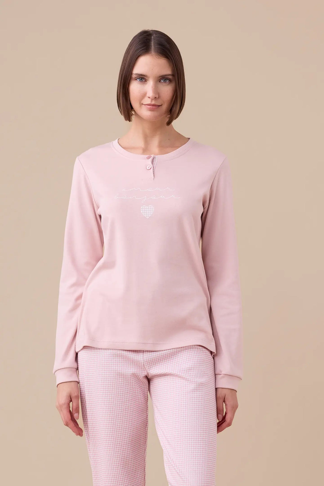 Pigiama donna caldo cotone folk top con scollo serafino, polsini sulle maniche e applicazione amour...