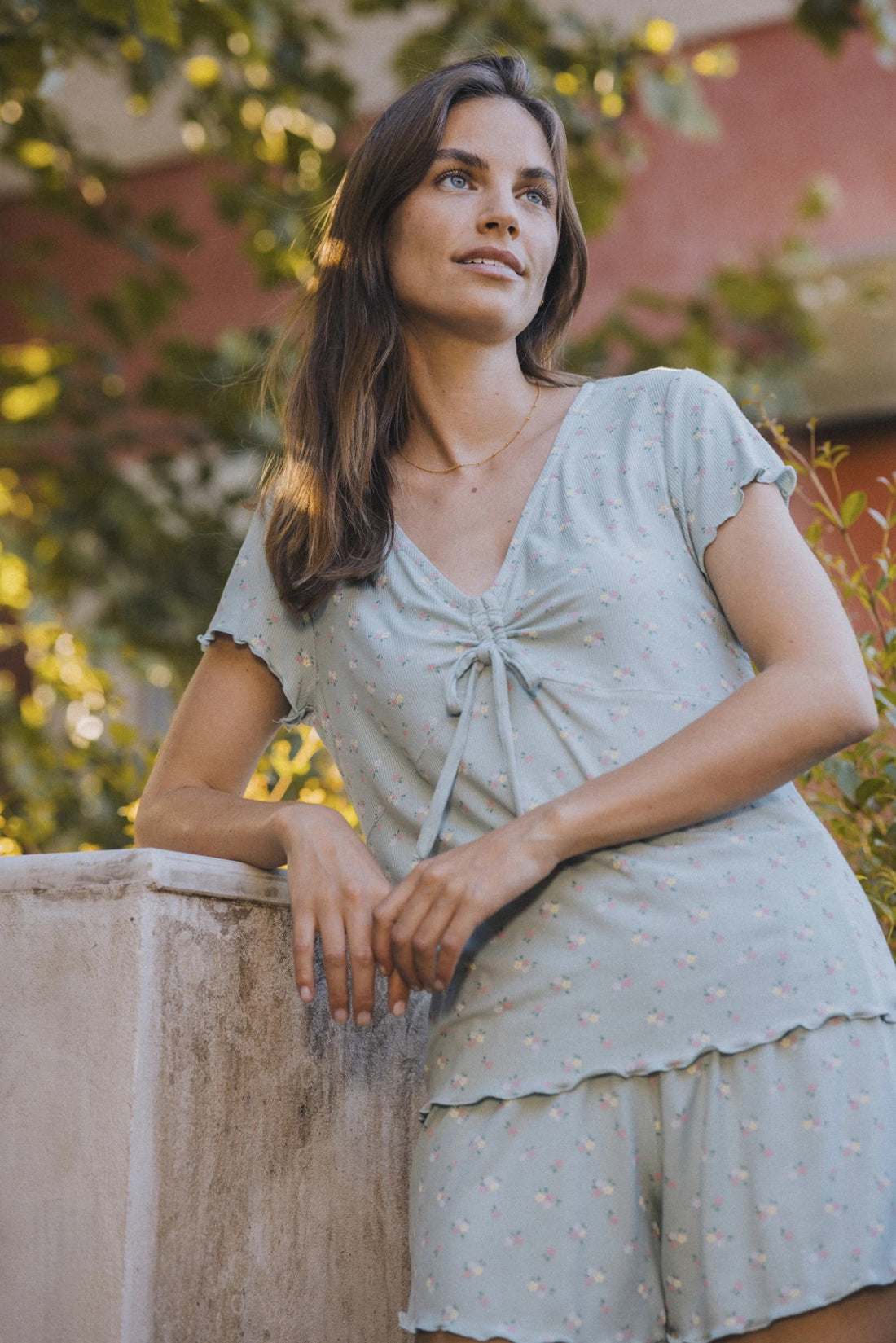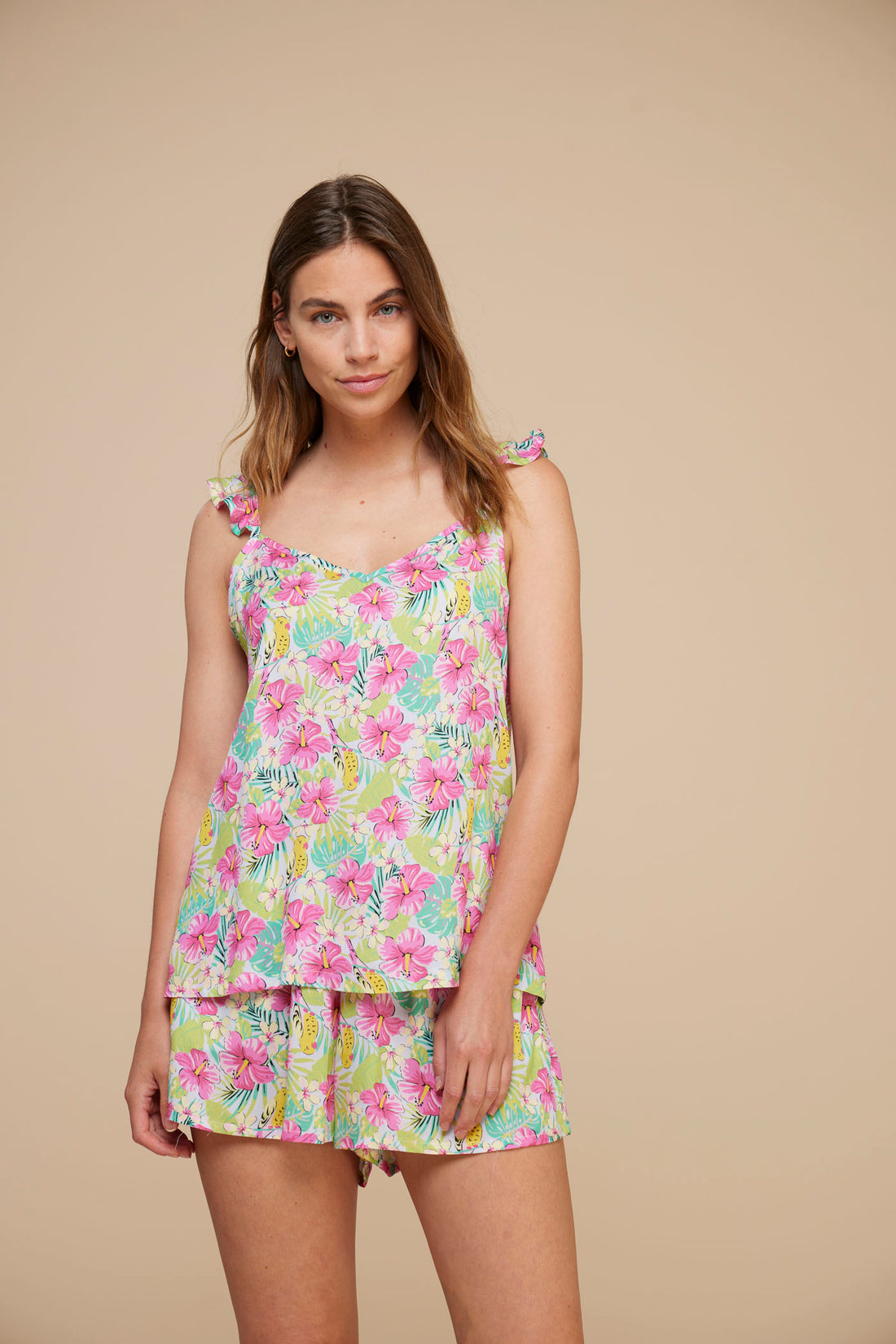 Completo donna viscosa ibiscus top con dettaglio rouches e pantalone corto