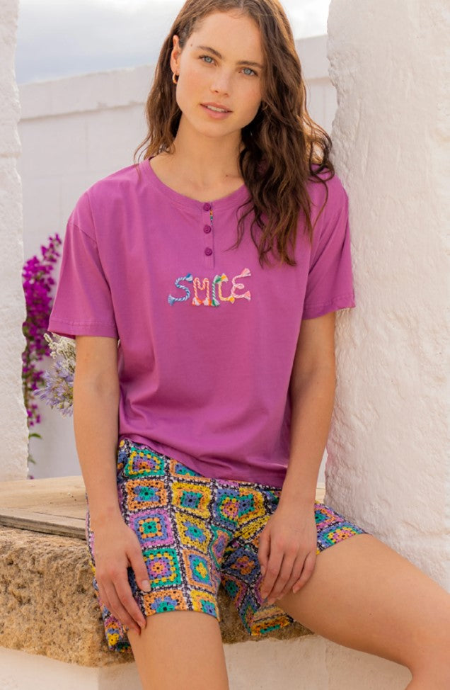 Pigiama donna corto cotone crochet top manica corta con abbottonatura a serafino e applicazione smile...