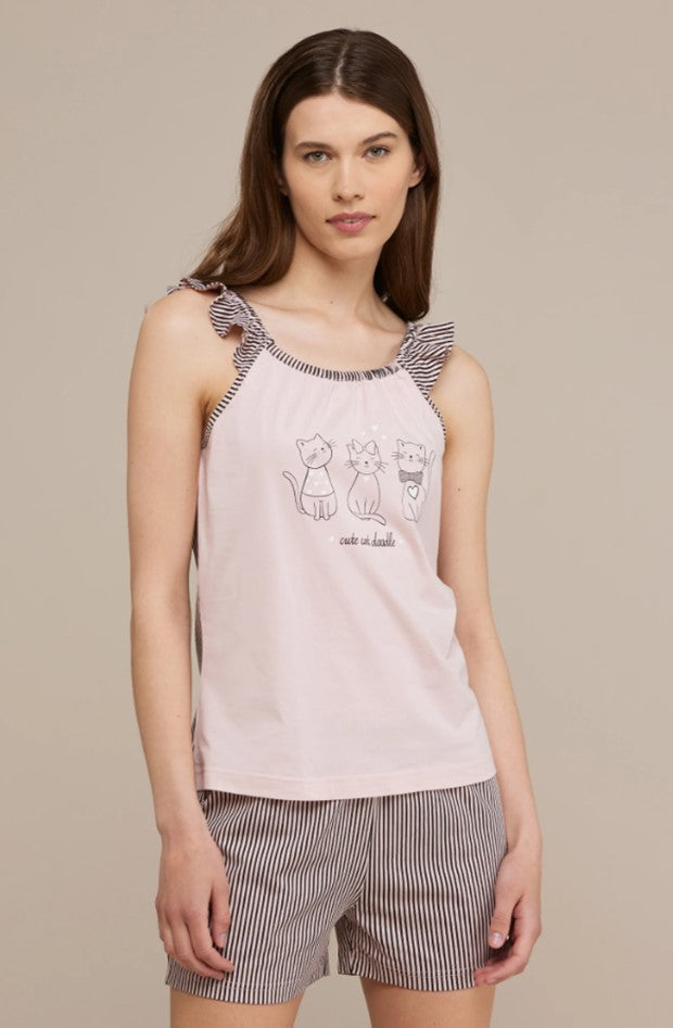 Pigiama donna cotone cute cat con top panna bretellina con rouches rigate e pantalone corto...