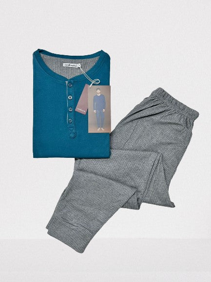 Pigiama uomo invernale in caldo cotone, top di colore unito con collo a tre bottoni...