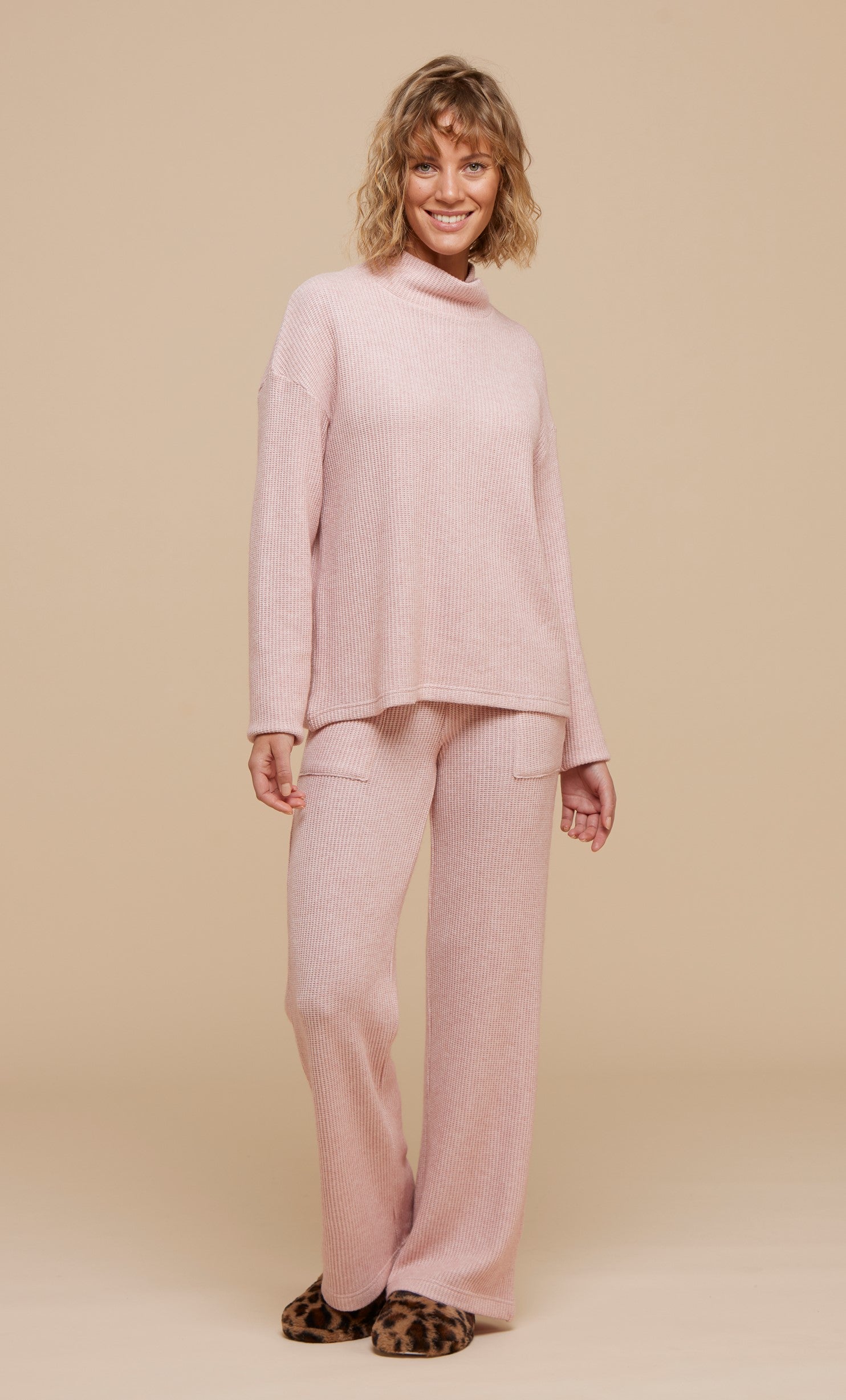 Completo donna maglina a coste carol top manica lunga con collo alto e pantalone lungo senza polsini con tasche sul davanti