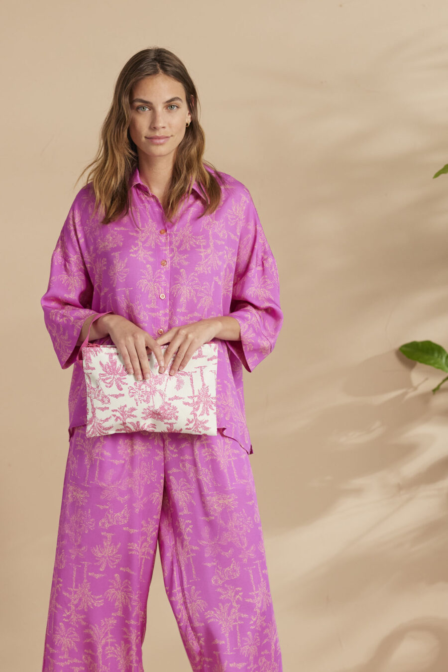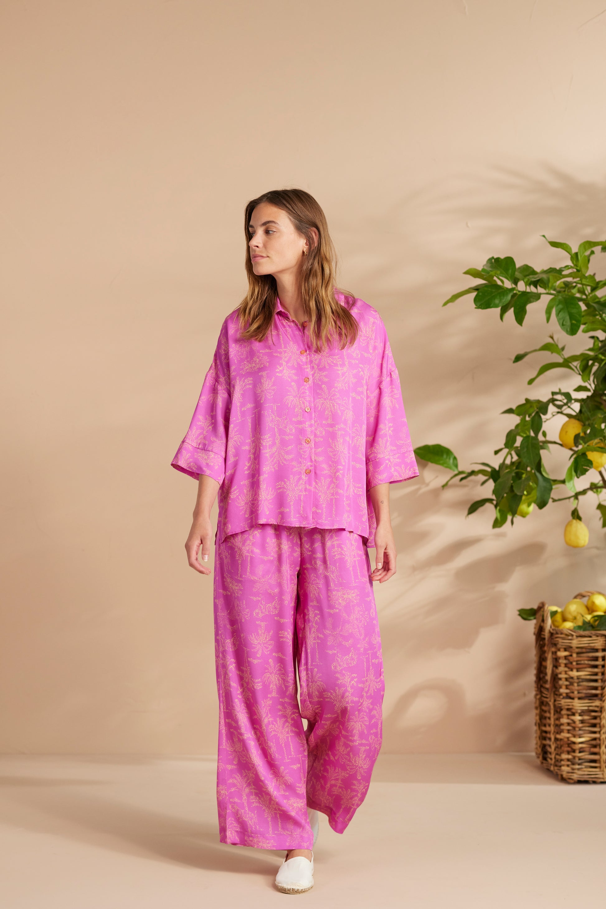 Completo donna viscosa palma top camicia con manica a 3/4 e pantalone a palazzo con stampa palme all over var. Fucsia Noi Di Notte