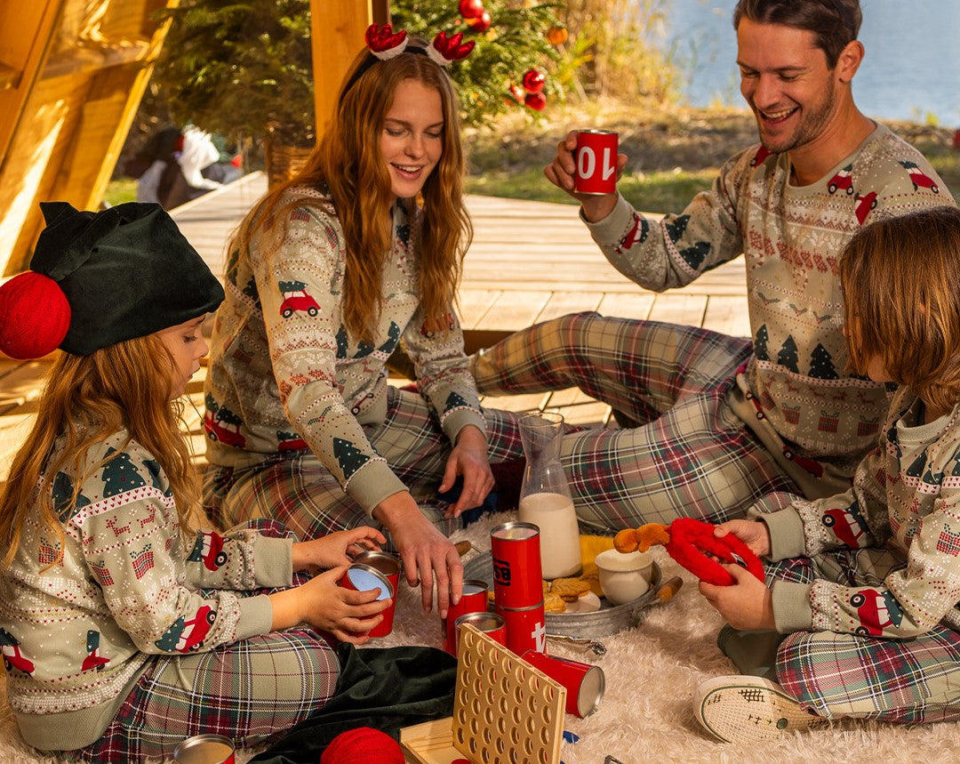 Family Match XMAS: Pigiama bambina/o XMAS in morbido caldo cotone a girocollo, top con simpatica stampa natalizia, top con polsini ai polsi e elastico sotto maglia e pantalone lungo senza polsini in elegante stampa scozzese.