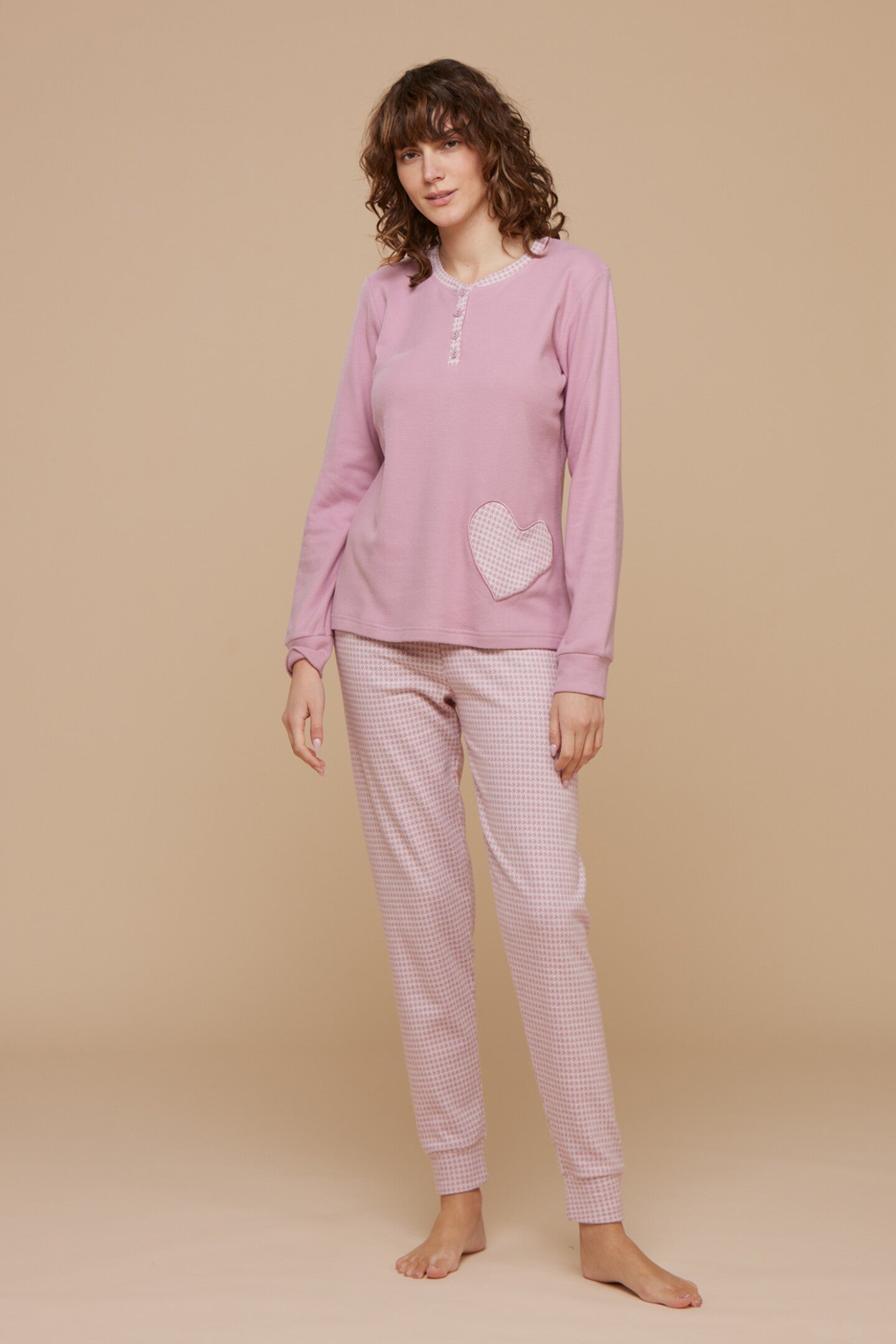 Pigiama donna punto milano pantalone con polsino con stampa top con polsino grigio con tasca a forma di cuore - var. rosa