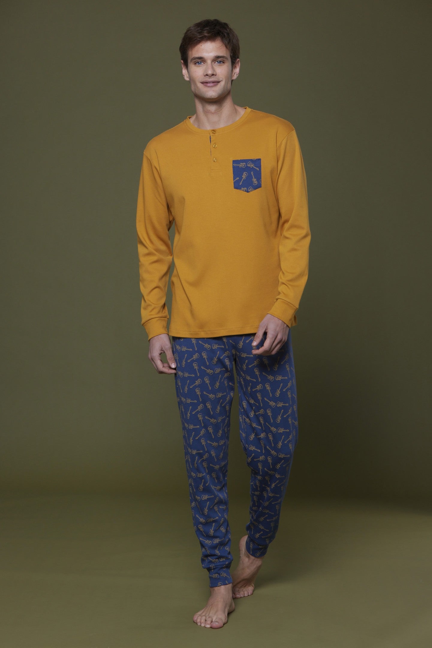Pigiama ragazzo caldo cotone chitarra pantalone blu con stampa chitarre con polsino e top giallo con taschino