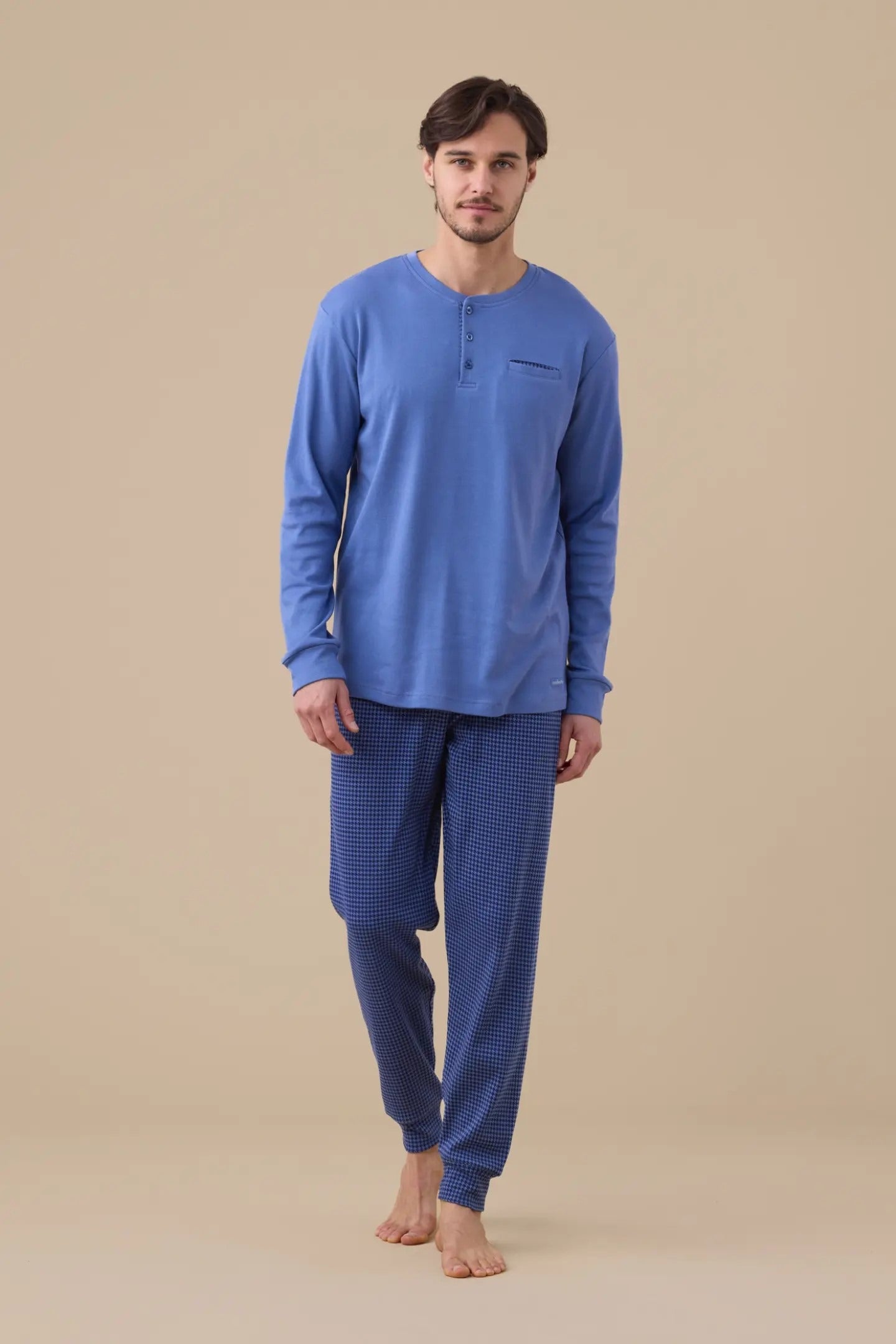 Pigiama uomo invernale in caldo cotone, top di colore unito con collo a tre bottoni e pantaloni in stampa pied de poule con polsino.