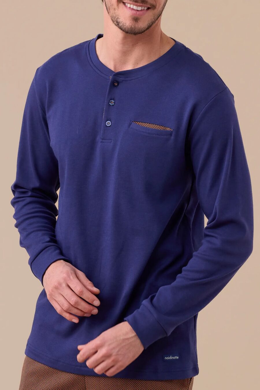 Pigiama uomo caldo cotone con top a tre bottoni e taschino laterale. Pantaloni con stampa spigata e polsino.