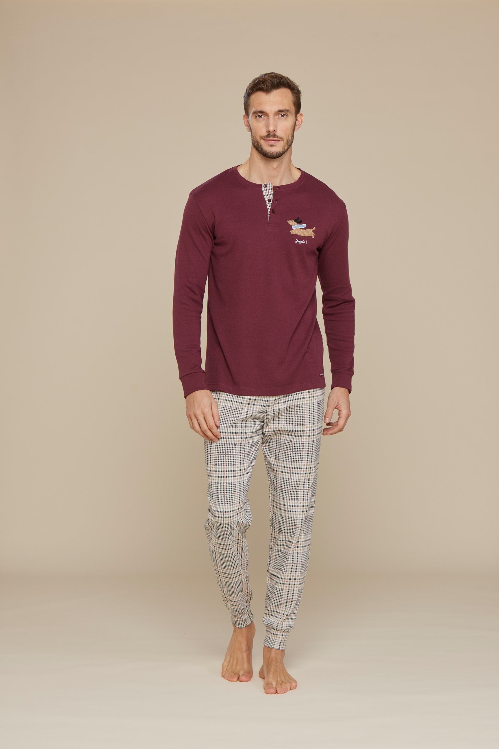 Pigiama uomo caldo cotone yuppie top bordeaux e pantalone con stampa e con polsino Rif. FC2718AS