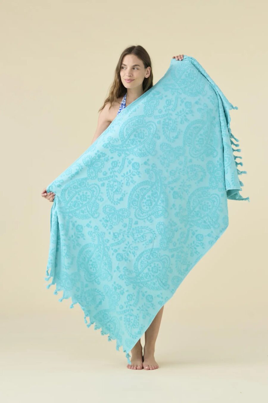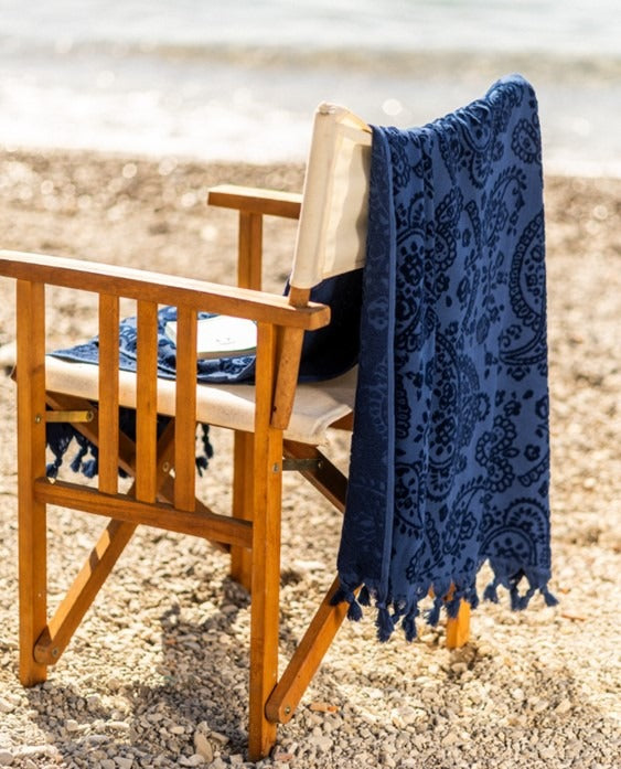 Telo mare in spugna velour rasato in elegante stampa cachemire e dettaglio nappine sul fondo. Misura: 90x170 cm