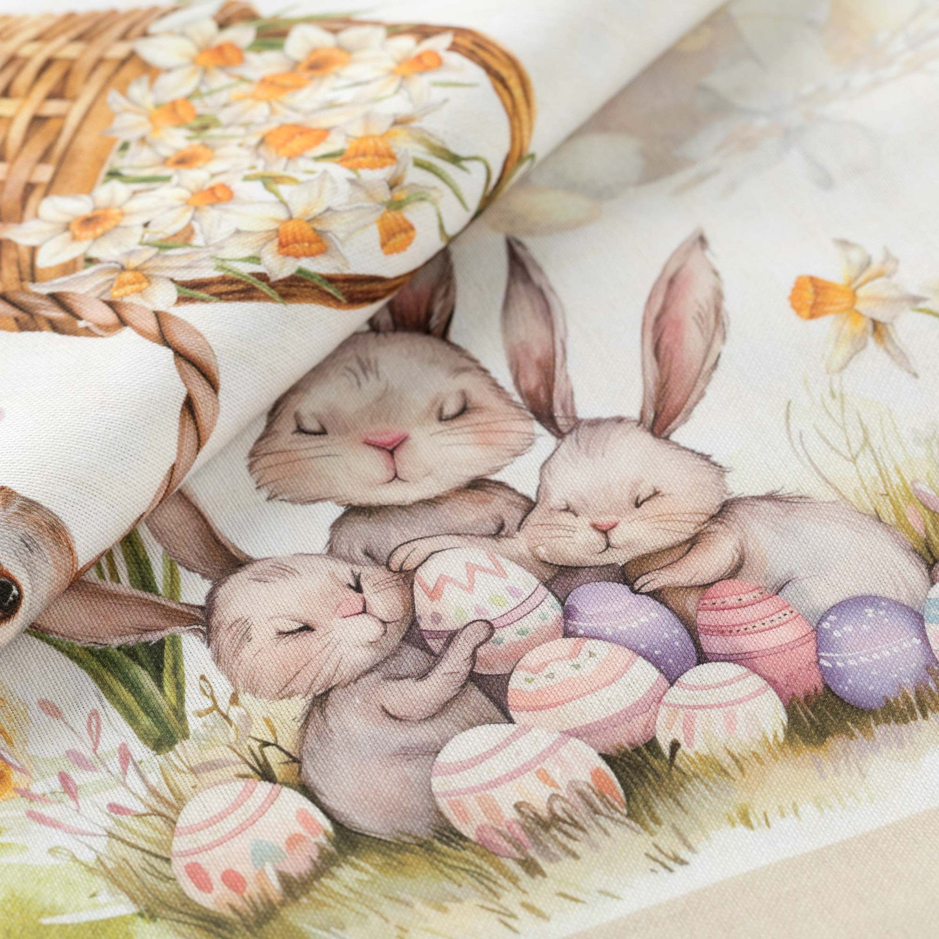 La Tovaglia Lily porta in tavola tutta l’atmosfera gioiosa e delicata della Pasqua. Il fondo bianco è impreziosito da una dolce fantasia a tema pasquale con coniglietti, cestini di paglia e ovetti colorati, perfetta per creare una mise en place accogliente e festosa. Realizzata in tessuto misto 75% cotone e 25% poliestere, la tovaglia Lily unisce la naturale morbidezza del cotone alla resistenza e praticità del poliestere. Il risultato è un tessuto piacevole al tatto, facile da lavare e pensato per mantenere nel tempo la brillantezza dei colori e la qualità della stampa. Disponibile 12 posti cm 140x240.